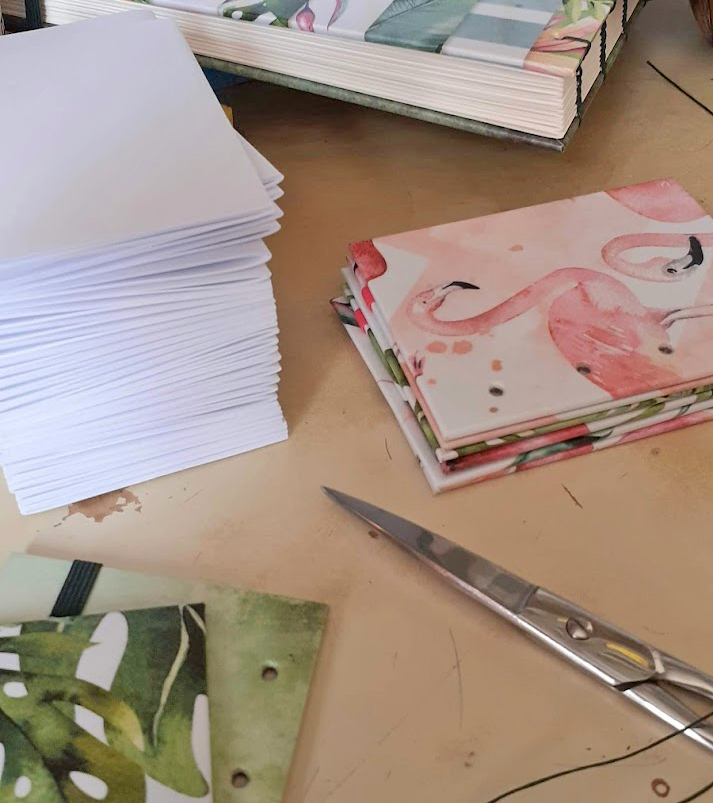 Zápisníky vyrábíme jednotlivě. Listy si sami potiskneme a ručně skládáme. Používané vazby nelze vyrobit strojově – každá z nich vyžaduje ruční práci. Díky tomu máme nad každým zápisníkem plnou kontrolu, od kvality tisku až po pevnost šití vazby.