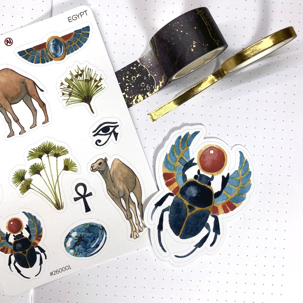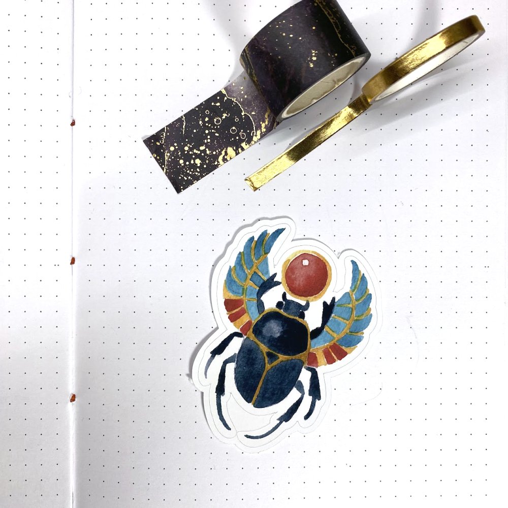 Skarab, brouk vruboun posvátný, který tlačí slunce po obloze a představoval boha Re. Symbol znovuzrození a výrazná samolepka pro vaše tvoření.