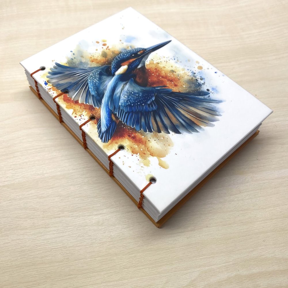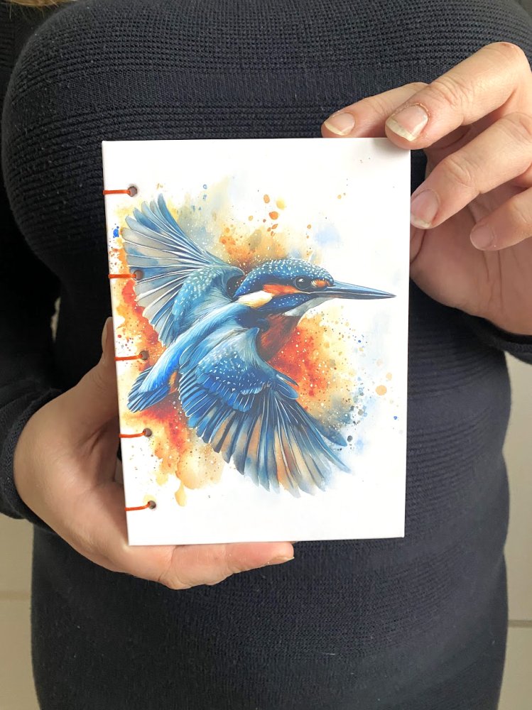 Ručně vyráběný zápisník s modrým ledňáčkem – čistý design, který nechá ilustraci vyniknout