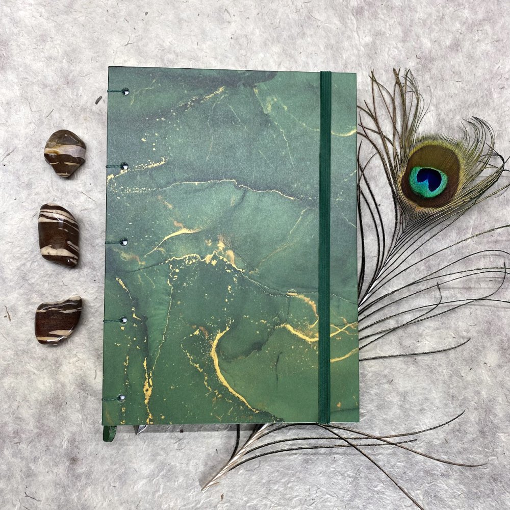 Ručně šitý koptskou vazbou, která zvládne všechno, co jí naložíte. Při vlepování samolepek a fotek se nedeformuje, dá se otevřít na plocho a nezavírá se a nikde nepřekáží, takže stránky využijete celé od kraje do kraje.