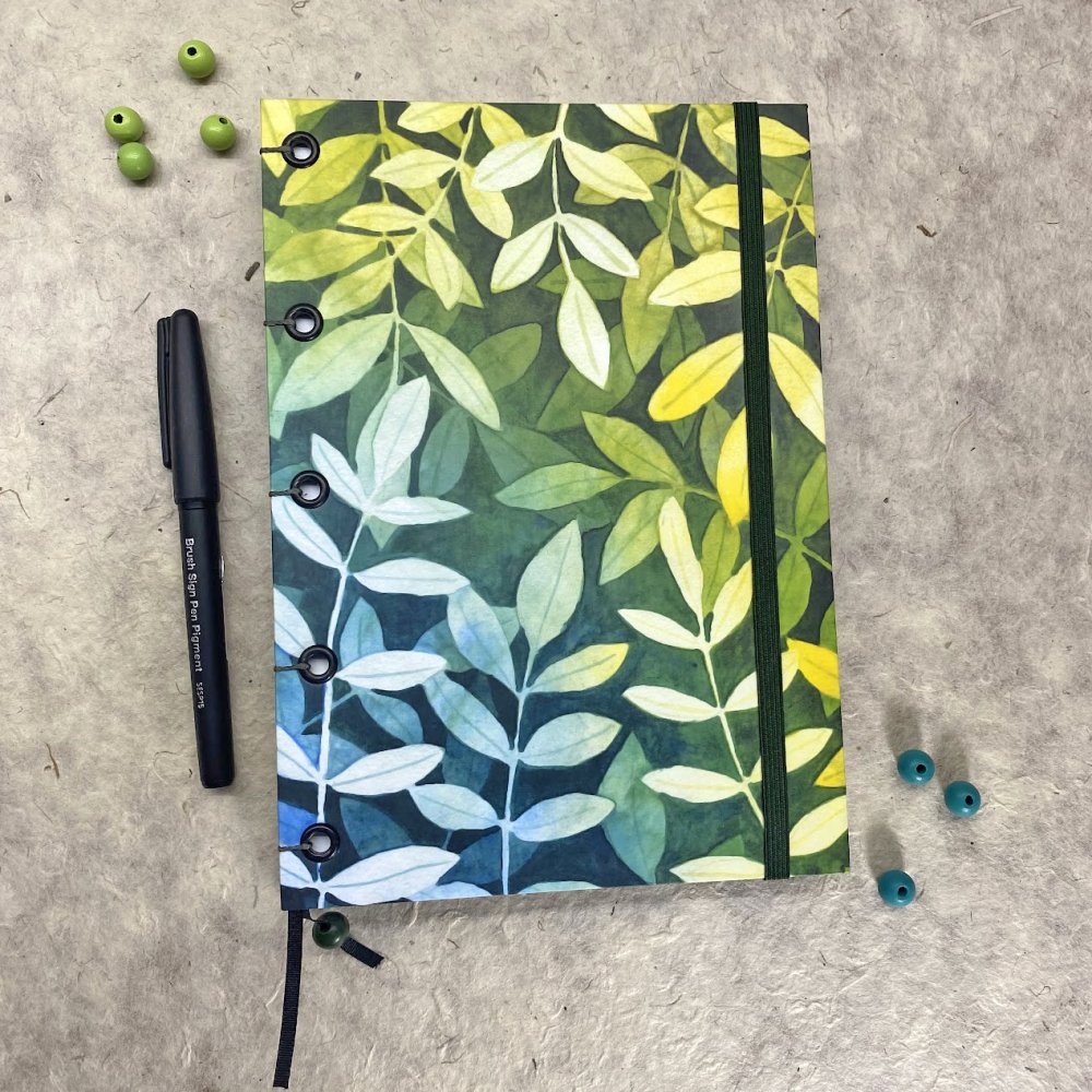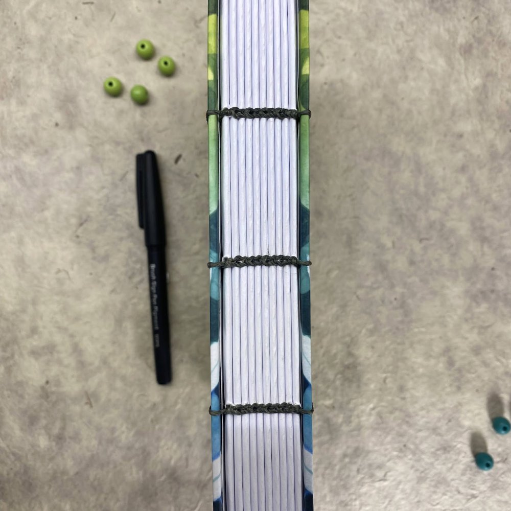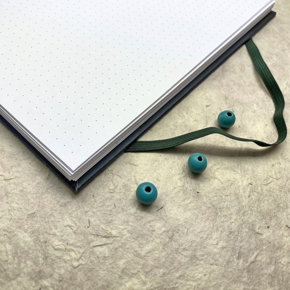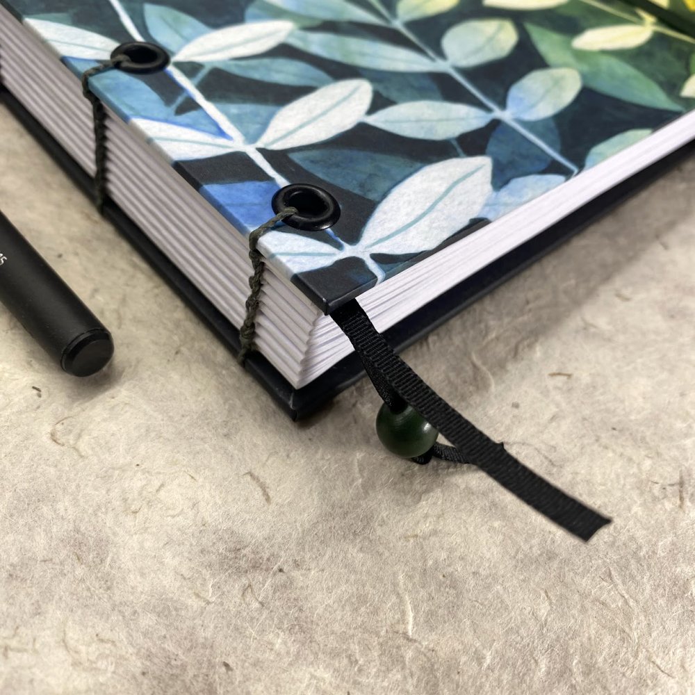 Ručně šitý koptskou vazbou, která zvládne všechno, co jí naložíte. Při vlepování samolepek a fotek se nedeformuje, dá se otevřít na plocho a nezavírá se. Vazba nikde nepřekáží, takže stránky využijete celé od kraje do kraje.