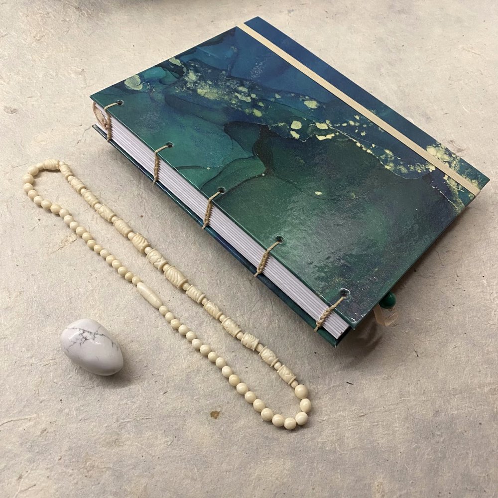 Ručně šitý koptskou vazbou, která zvládne všechno, co jí naložíte. Při vlepování samolepek a fotek se nedeformuje, dá se otevřít na plocho a nezavírá se a nikde nepřekáží, takže stránky využijete celé od kraje do kraje.