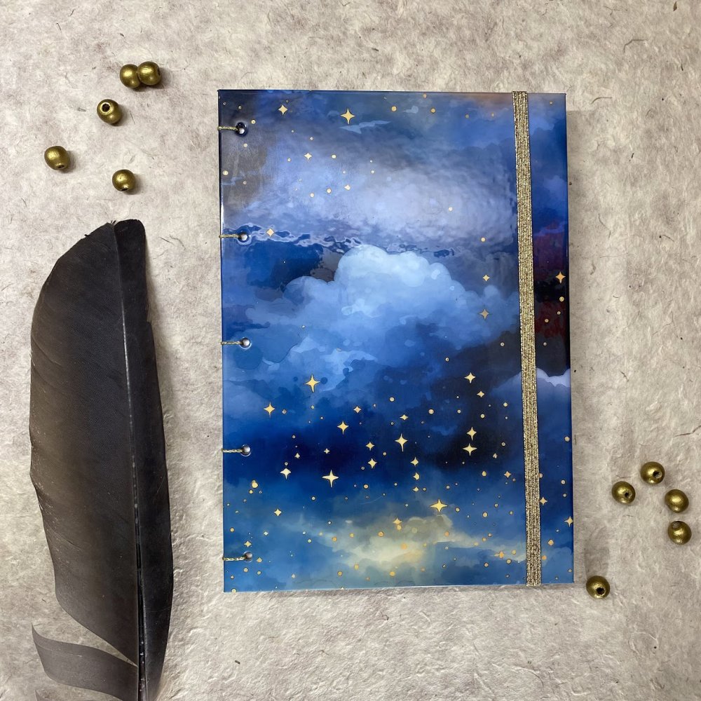 Obálka s motivem nočního nebe a jemných mraků působí klidně, a přitom dodává pocit, že všechno má svůj prostor a čas. Zlaté detaily – šití i gumička – jsou nejen praktické, ale také zpříjemní chvíle, kdy po zápisníku sáhnete.
