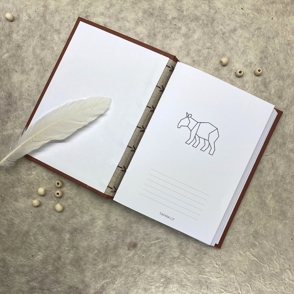 - ručně šitá vazba se hřbetem – zápisník se otevírá naplocho a pohodlně se do něj píše až ke krajům